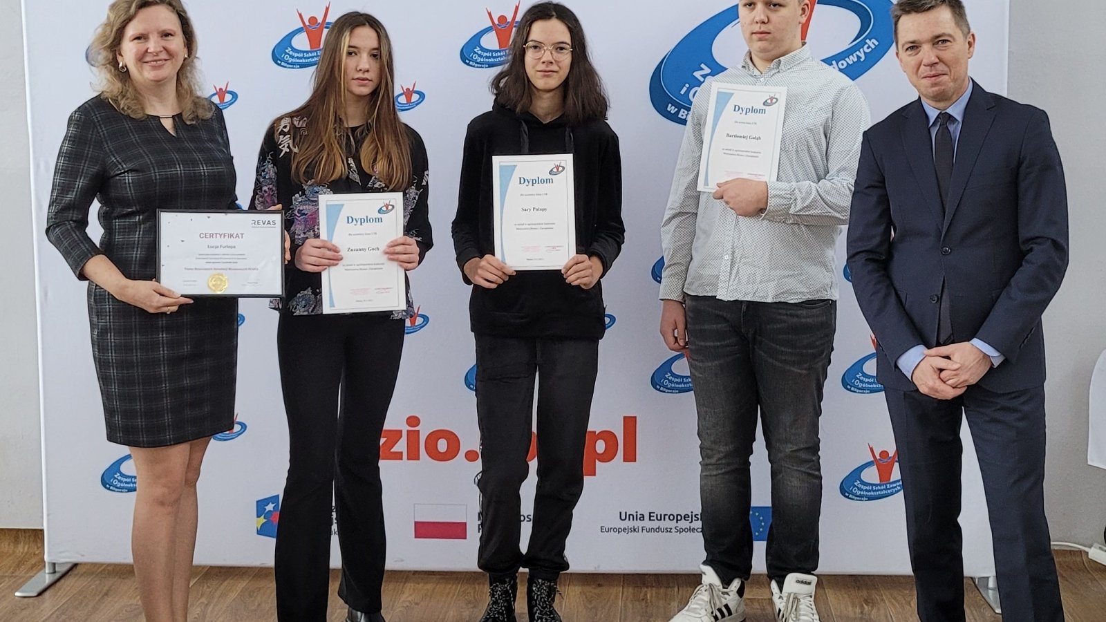 Nasi uczniowie z klasy ITR (technik reklamy) zakończyli udział w ogólnopolskim konkursie „Mistrzostwa Biznes i Zarządzanie”. Skład drużyny: Zuzanna Goch, Bartłomiej Gołąb i Sara Pułapa.