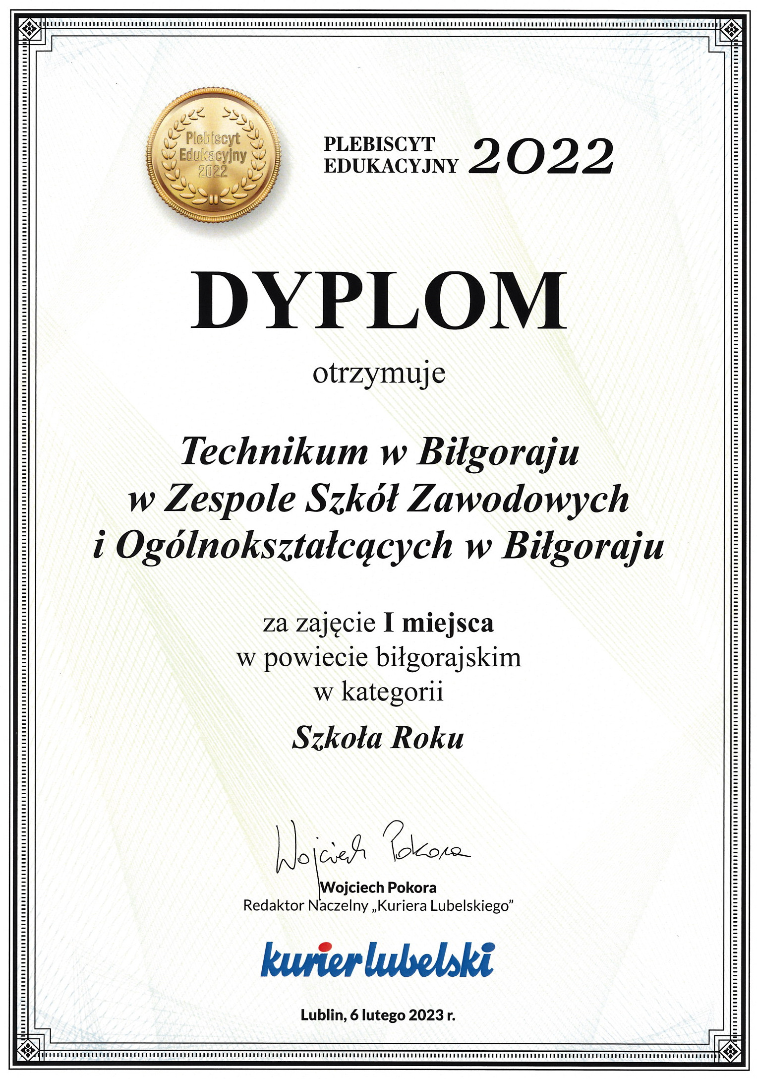 Technikum w Zespole Szkół Zawodowych i Ogólnokształcących w Biłgoraju uzyskało I miejsce w kategorii Szkoła Roku w powiecie biłgorajskim w plebiscycie „Kuriera Lubelskiego”. Zwycięzców wyłoniło głosowanie czytelników. Celem plebiscytu edukacyjnego „Kuriera Lubelskiego” było nagrodzenie najlepszych nauczycieli oraz szkół na szczeblu powiatowym i wojewódzkim.