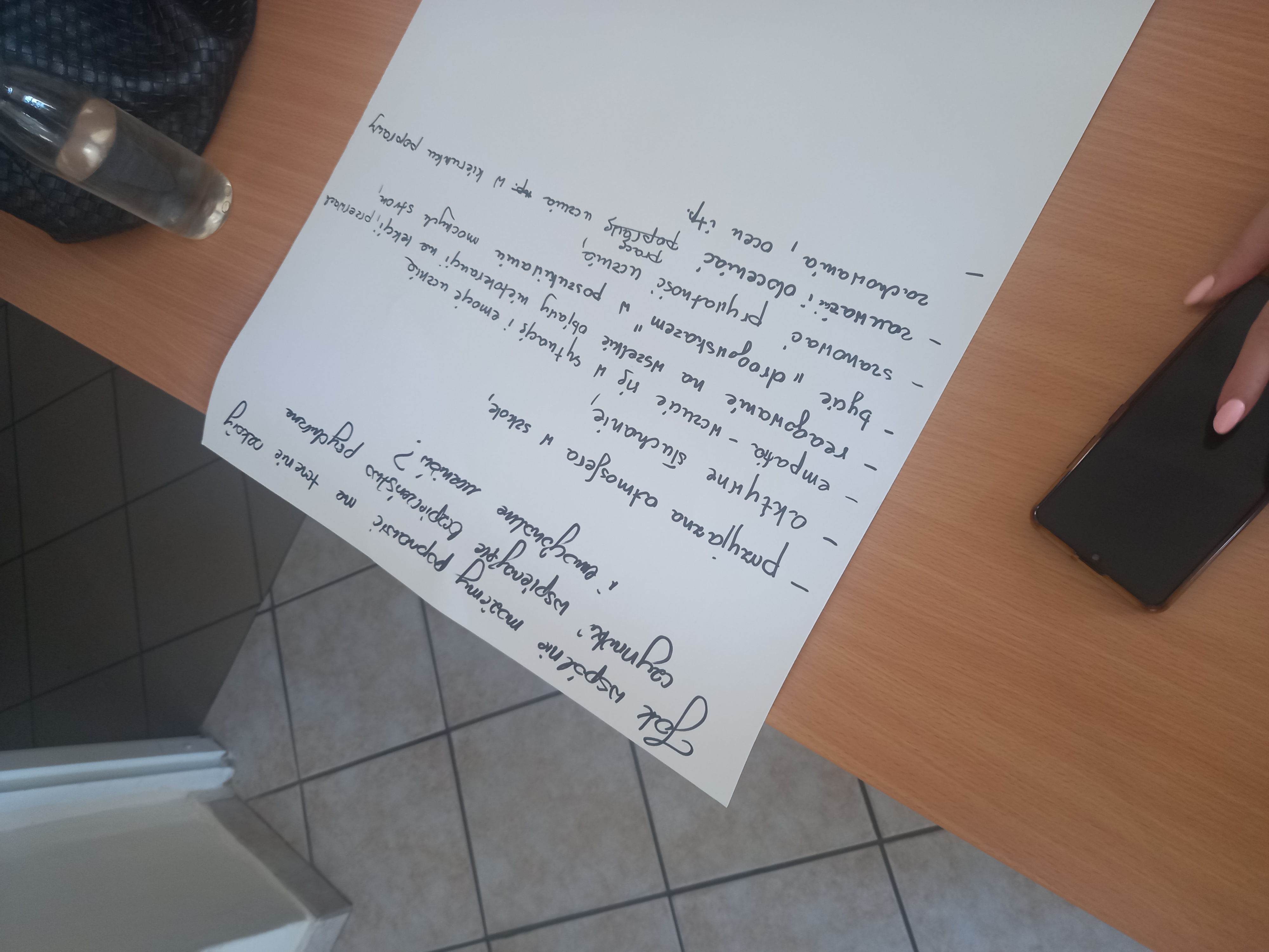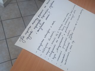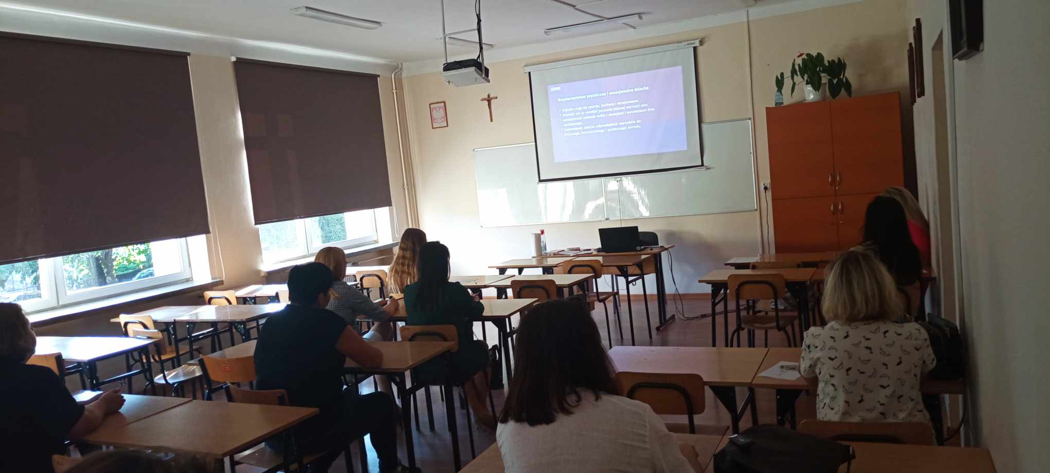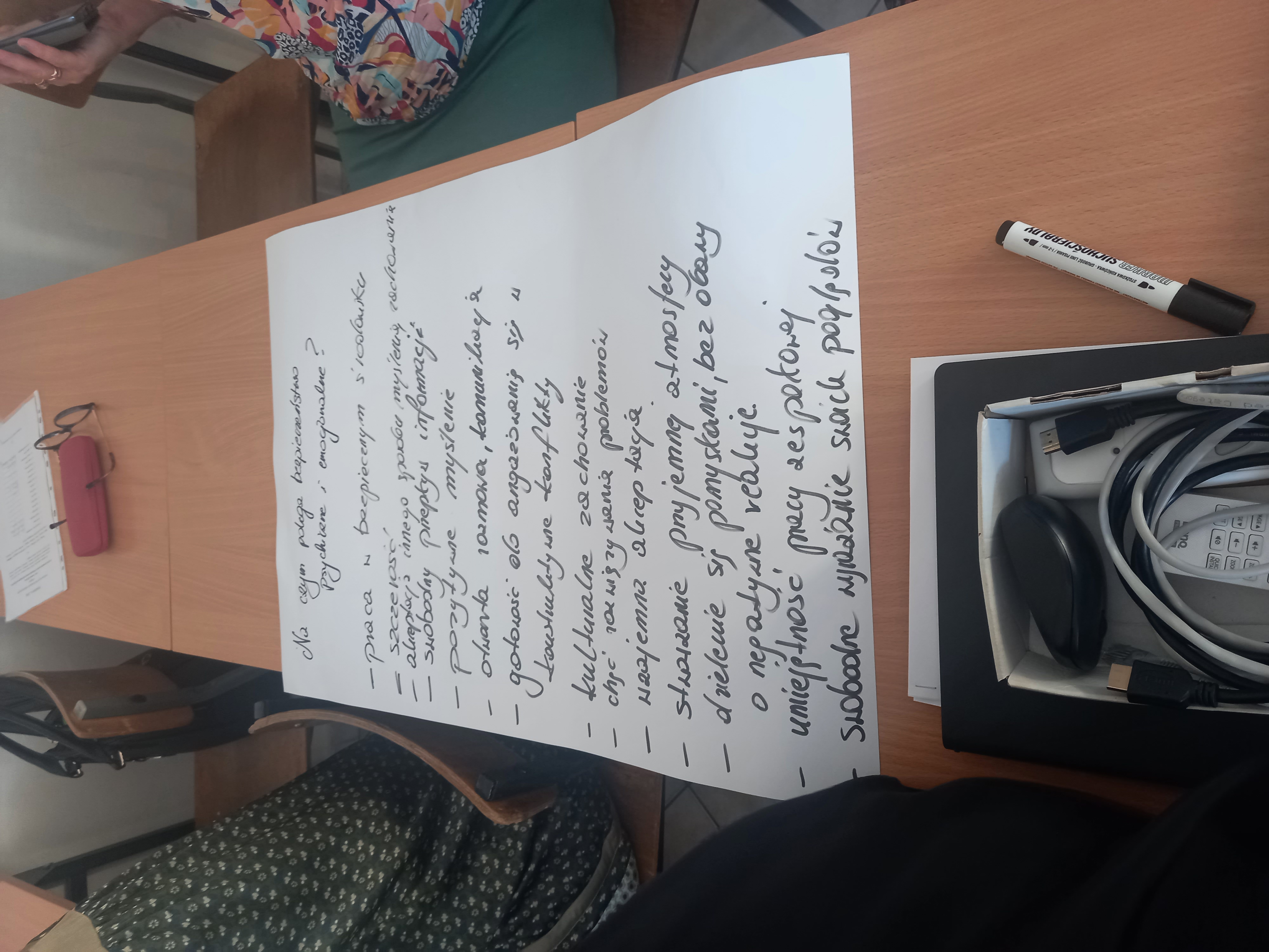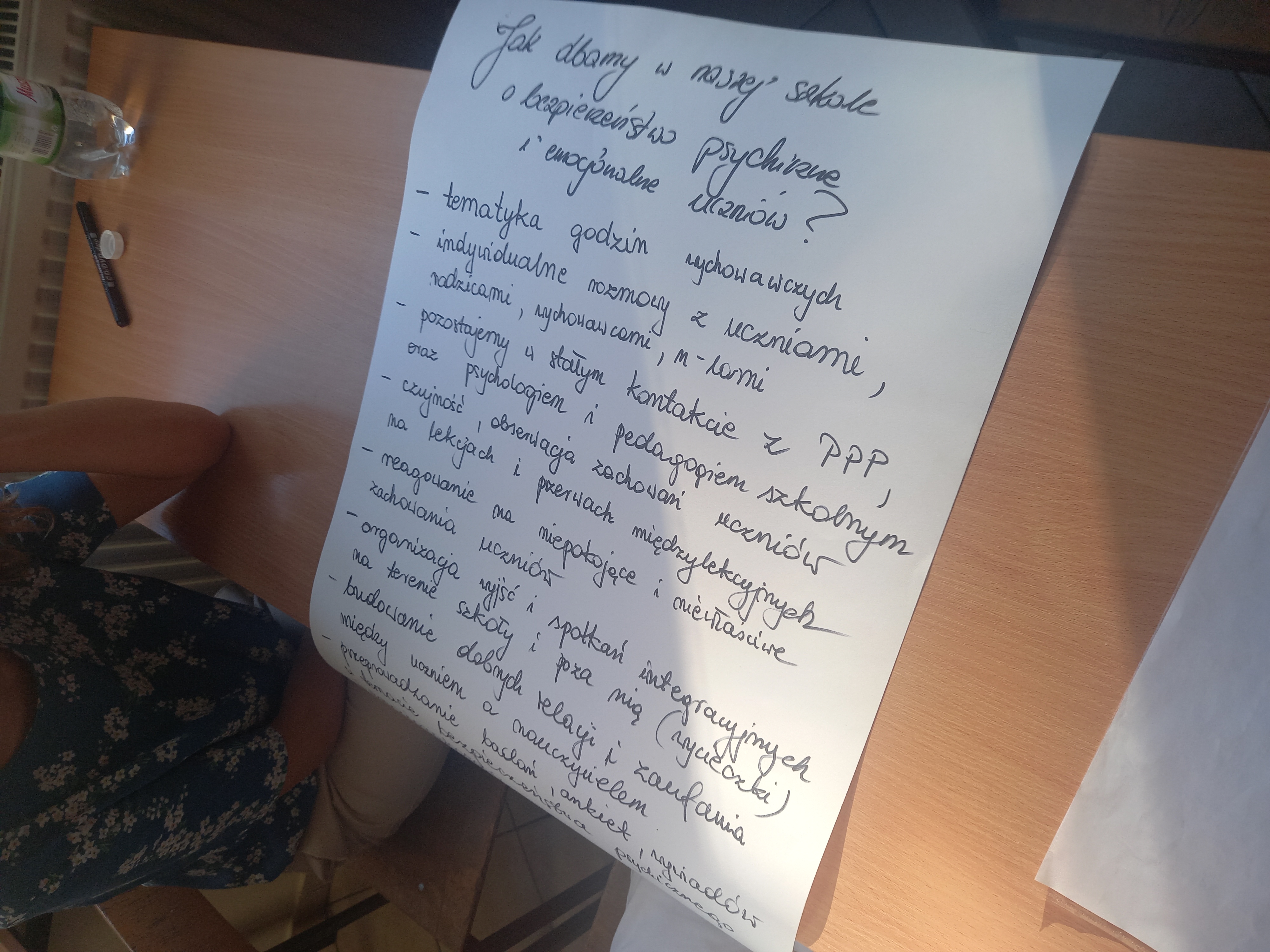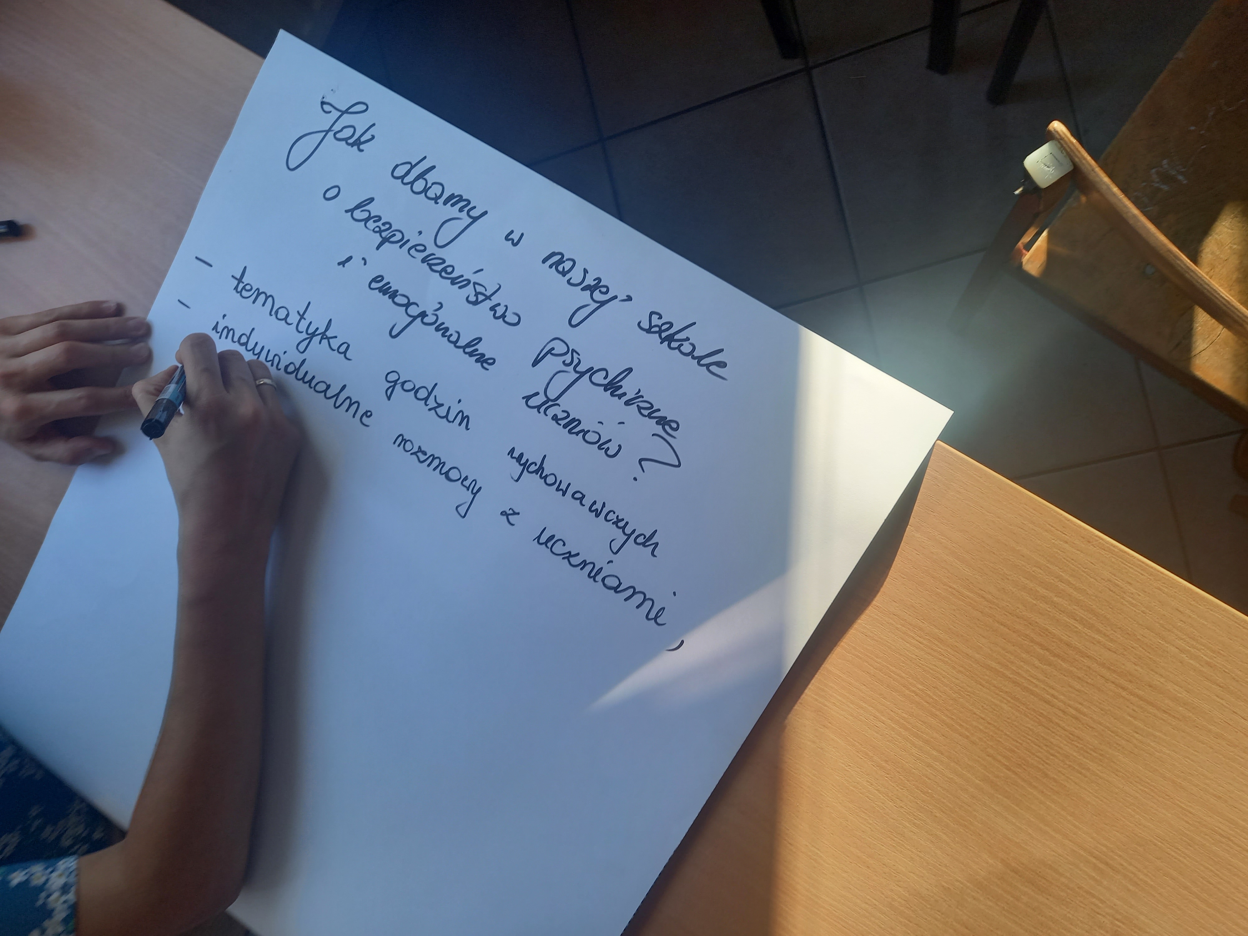Grupa 20 nauczycieli uczestniczyła warsztatach prowadzonych przez psychologa szkolnego Joannę Cudziło-Gil dotyczące bezpieczeństwa psychicznego i emocjonalnego uczniów w szkole. Warsztaty miały na celu znalezienie odpowiedzi na pytania związane ze zdrowiem psychicznym np. Czym jest bezpieczeństwo psychiczne i emocjonalne ucznia w szkole?, Jak wspólnie możemy poprawić na terenie naszej placówki czynniki wspierające bezpieczeństwo psychiczne i emocjonalne dziecka? Podczas tego spotkania nauczyciele stworzyli ,,mapę myśli” – zbiór pomysłów i wskazówek jak dbać o zdrowie psychiczne naszych uczniów w szkole.