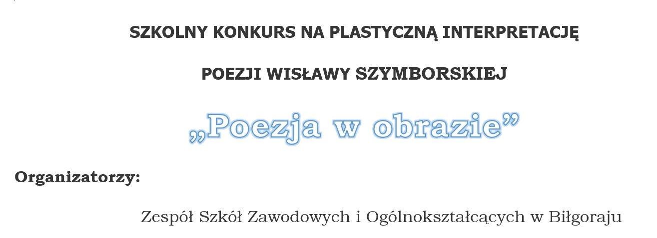 Zapraszamy uczniów naszej szkoły do wzięcia udziału w Szkolnym Konkursie Plastycznym "Poezja w obrazie". Należy wykonać pracę plastyczną inspirowaną wybranym wierszem Wisławy Szymborskiej (może to być obraz realistyczny, symboliczny, pokazanie nastroju wiersza itp.). Technika pracy formatu A3 lub A4 jest dowolna.