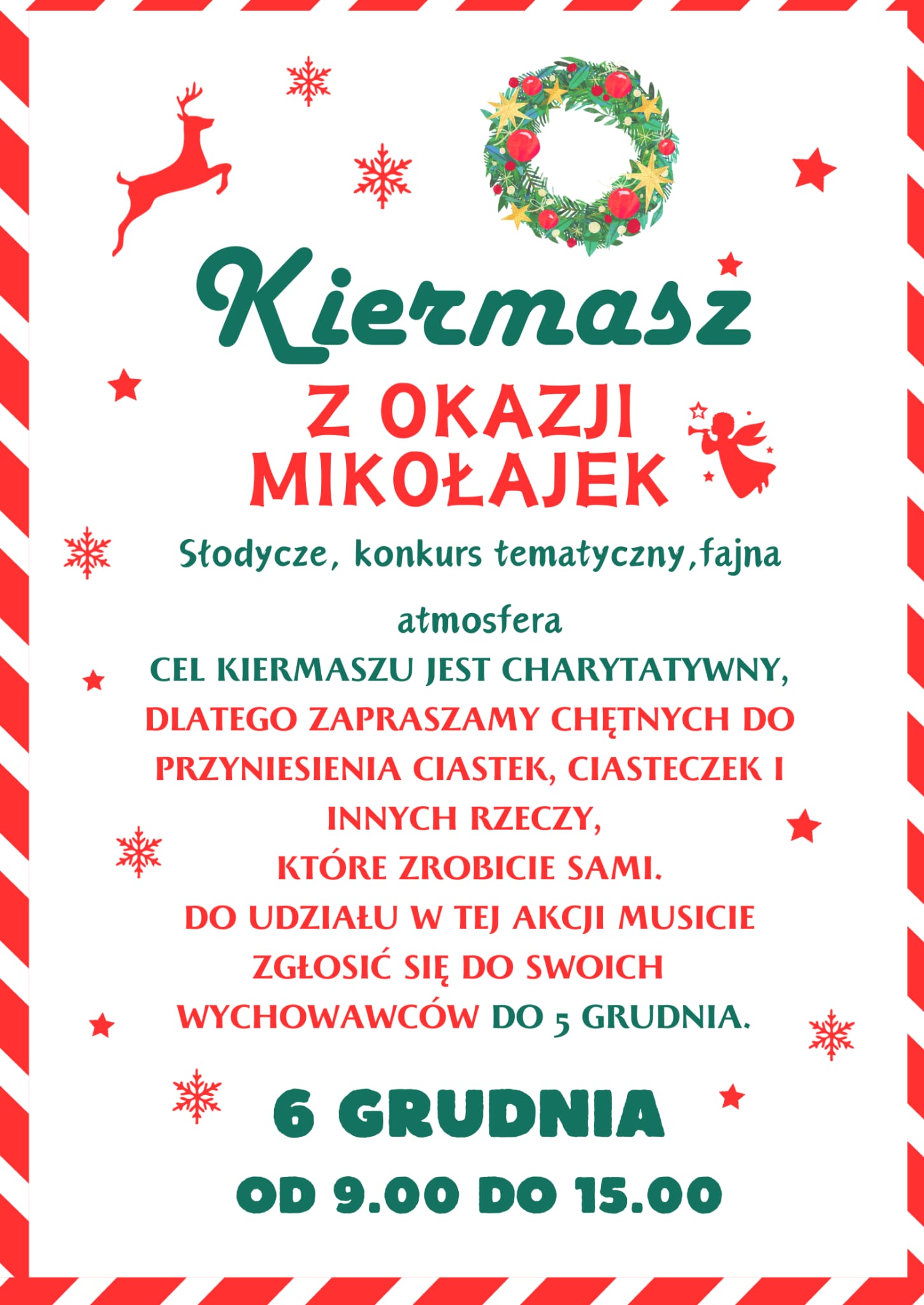 Szkolne Koło Caritas zaprasza na kiermasz mikołajkowy, który odbędzie się 6.12.2023 w głównym budynku naszej szkoły. Do nabycia będą: ciasta, ciasteczka, ozdoby świąteczne a cały dochód będzie przeznaczony na pomoc swiąteczną dla uczniów naszej szkoły.
