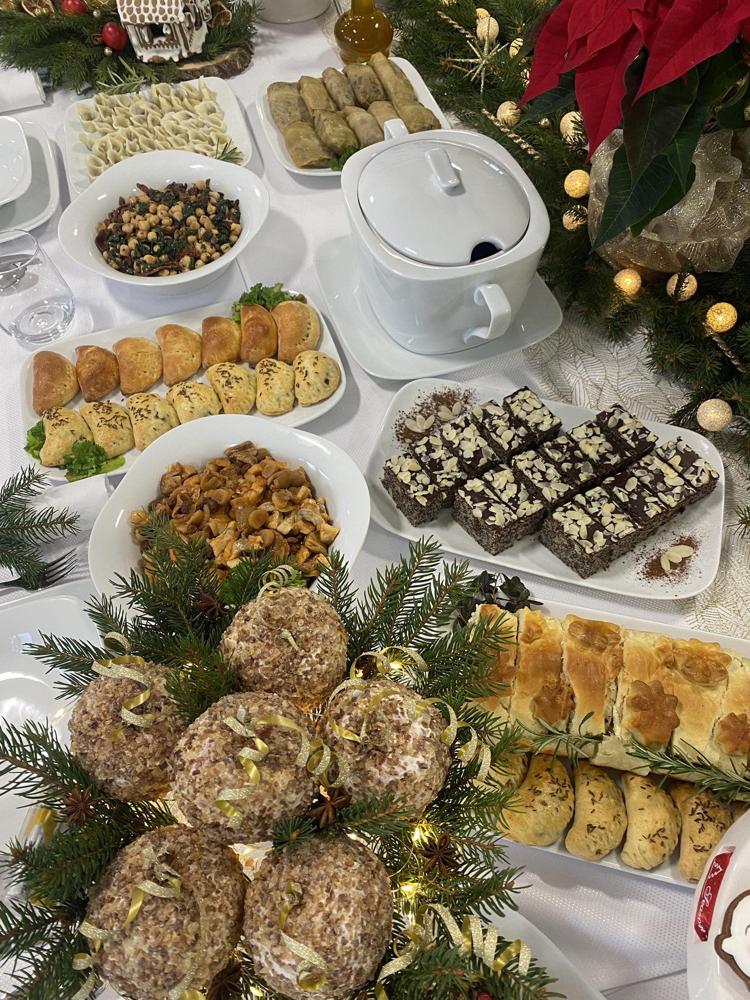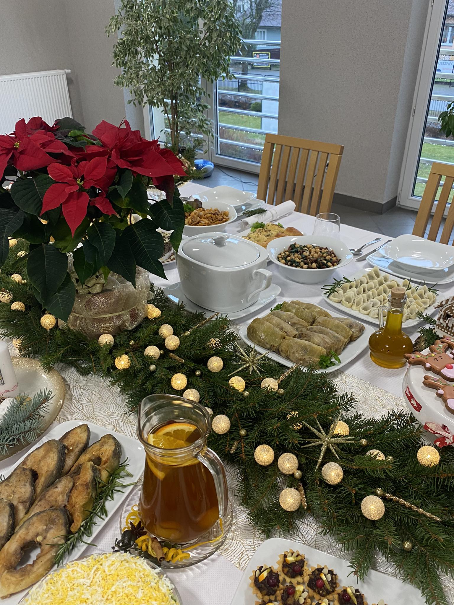 Potrawy zaprezentowane na świątecznym stole były utrzymane w tradycyjnym polskim klimacie. Były to takie dania jak: barszcz wigilijny z uszkami, pierożki drożdżowe z kaszą, kulebiak, kapuśniaczki, karp smażony, tymbaliki z dorsza, śledzie pod pierzynką i po kaszubsku, gołąbki z kaszą i grzybami, sałatka z ciecierzycy, kompot z suszonych owoców.
