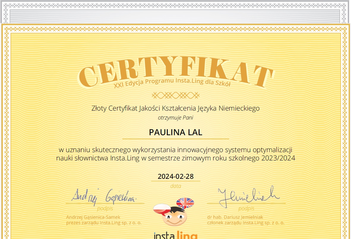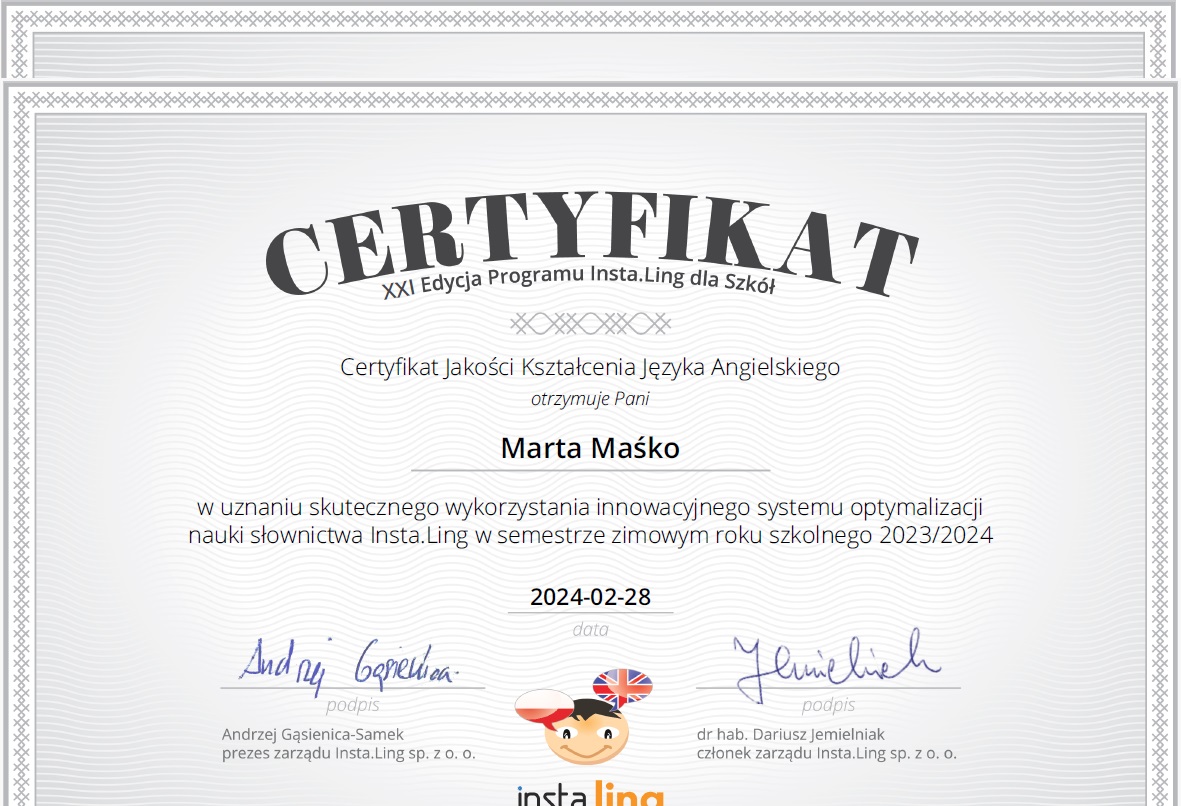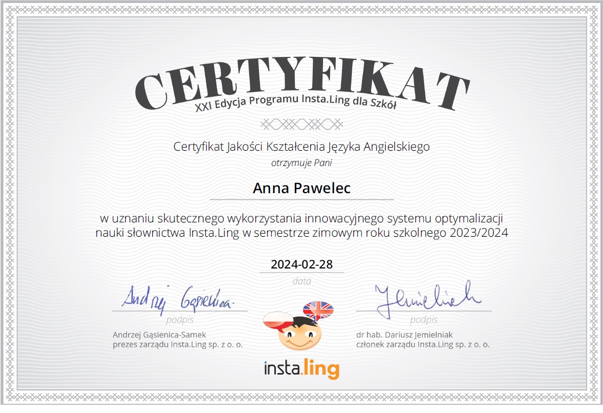Miło nam poinformować, że po raz kolejny zdobyliśmy Certyfikat Jakości Kształcenia Języka Angielskiego oraz Języka Niemieckiego w uznaniu skutecznego wykorzystania innowacyjnego systemu optymalizacji nauki słownictwa Insta.Ling w semestrze zimowym roku szkolnego 2023/2024.