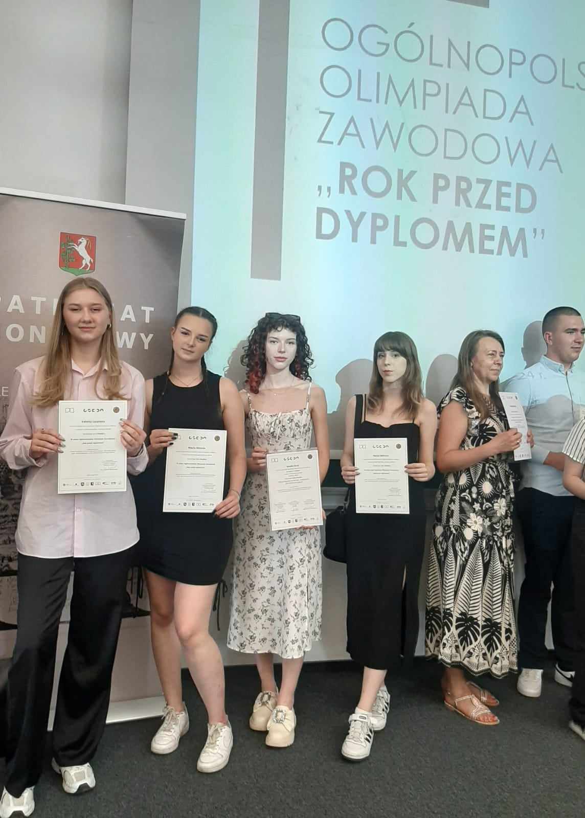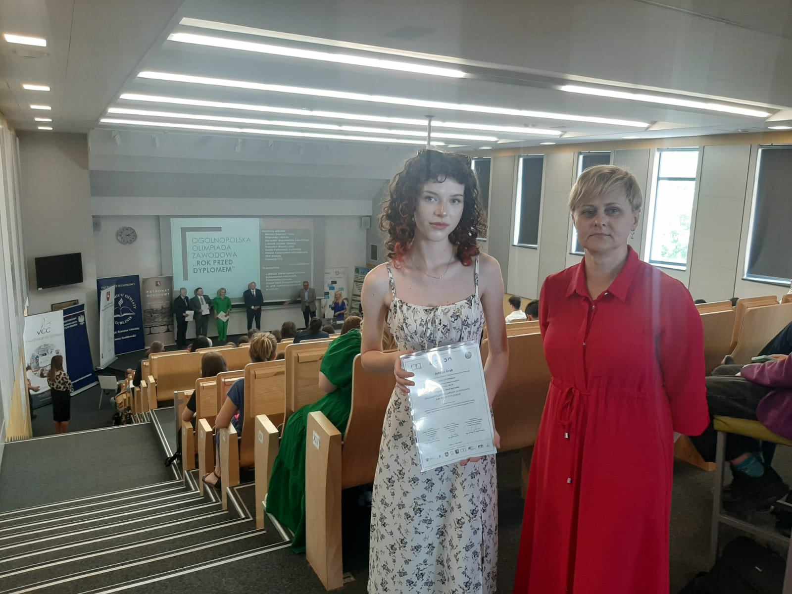 27.05.2024 r. w auli Wydziału Budownictwa i Architektury Politechniki Lubelskiej odbyła się konferencja podsumowująca wyniki Ogólnopolskiej Olimpiady Zawodowej „Rok przed dyplomem”. Wyłoniono 75 laureatów I, II i III miejsca, którym wręczono dyplomy, drobny sprzęt elektroniczny i sportowy ufundowany przez Kuratorium Oświaty w Lublinie i Urząd Marszałkowski. Gratulacje dla uczennicy naszej szkoły Amelii Grab , która otrzymała tytuł laureata II miejsca w zawodzie technik usług fryzjerskich. Olimpiadę honorowym patronatem objęli: Minister Edukacji i Nauki, Wojewoda Lubelski, Marszałek Województwa Lubelskiego, Lubelski Kurator Oświaty, Prezydent Miasta Lublin, Rektor Politechniki Lubelskiej, Polskie Towarzystwo Informatyczne, PKP Intercity, Fundacja VCC.