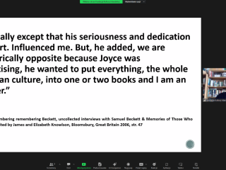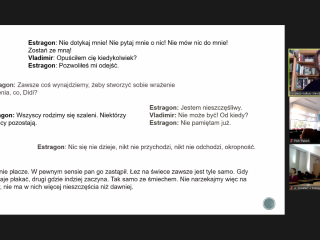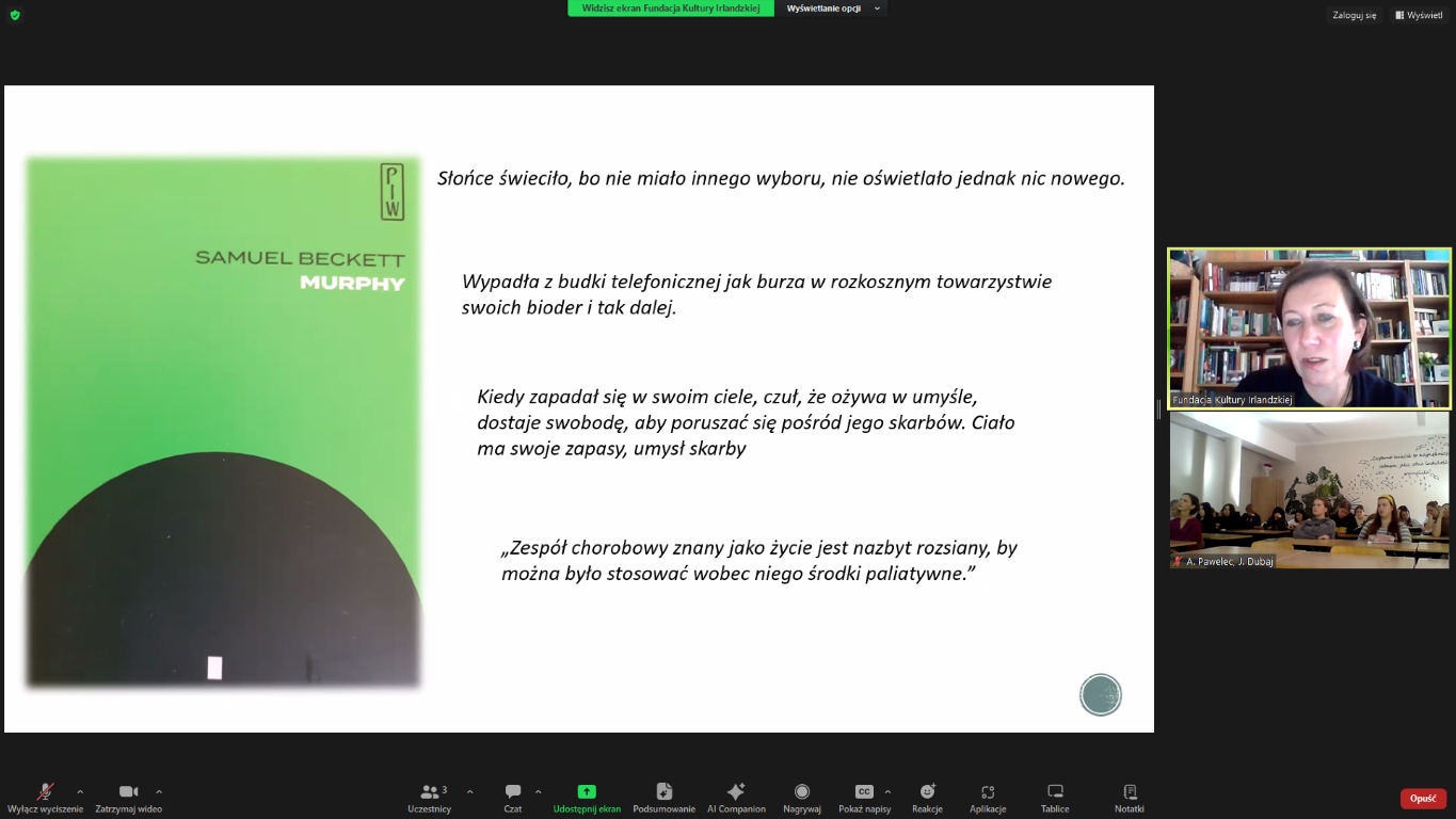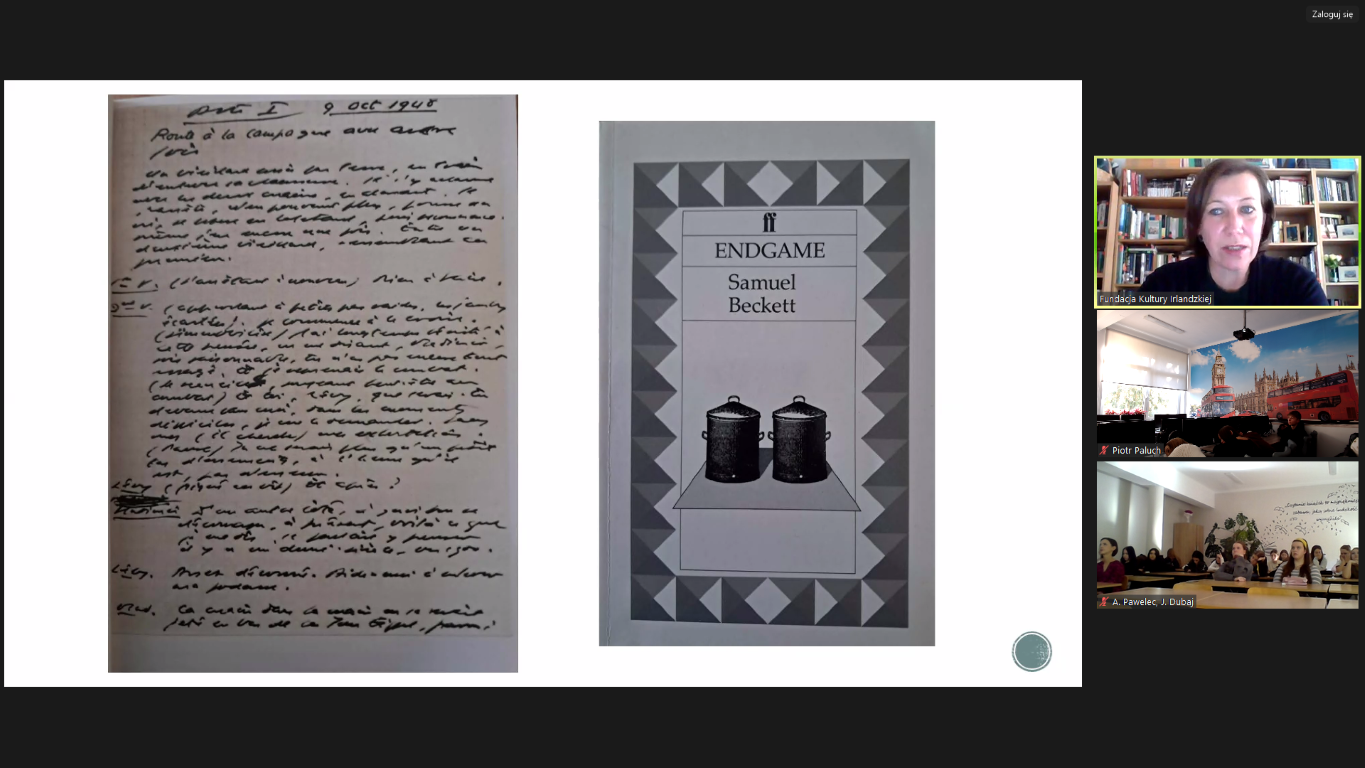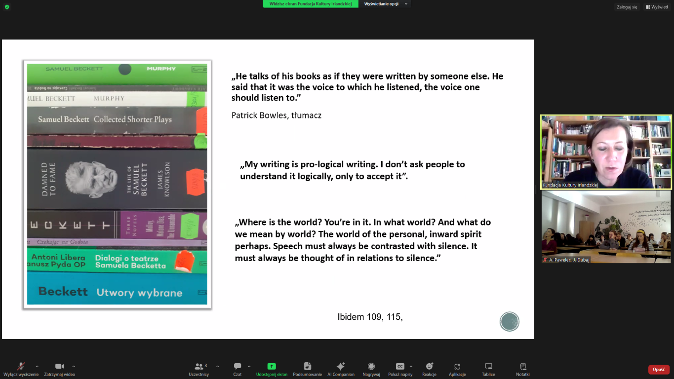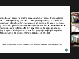Temat spotkania to: „Ludzkość to my, czy nam się podoba czy nie” – w świecie twórczości Samuela Becketta, z okazji 55 rocznicy Literackiego Nobla dla wszechstronnego irlandzkiego twórcy między innymi teatru absurdu, znanego chyba najbardziej z dramatu „Czekając na Godota” z 1952 roku.