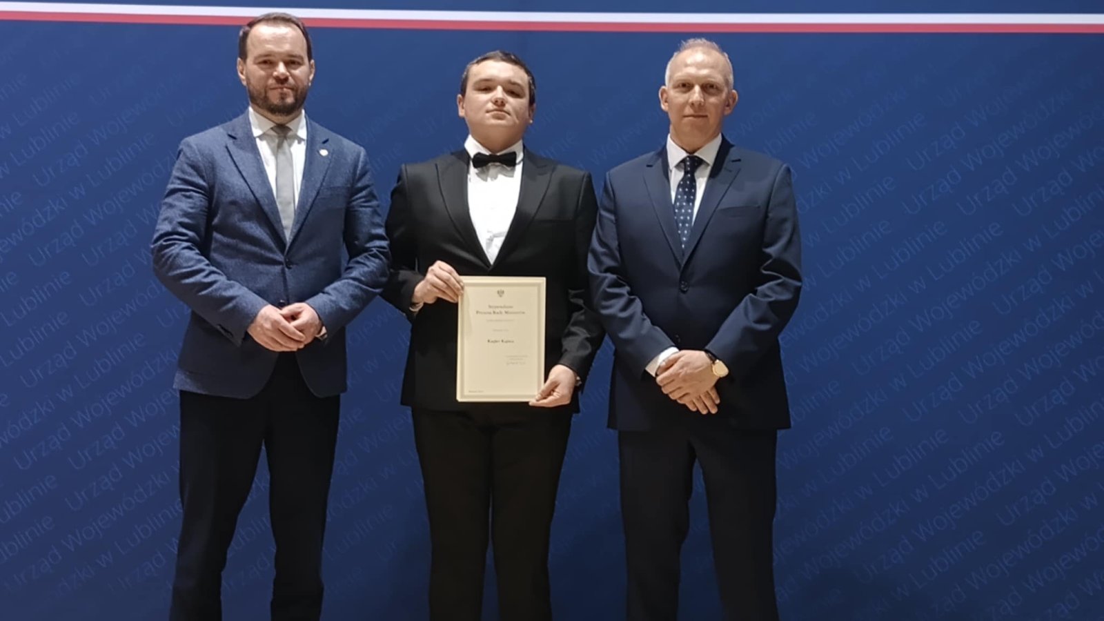 Podczas Uroczystości Wojewoda Lubelski Krzysztof Komorski i Kurator Oświaty Tomasz Szabłowski wręczyli 229 uczniom ze szkół ponadpodstawowych województwa lubelskiego dyplomy potwierdzające przyznane stypendia. Wśród nagrodzonych był uczeń naszej szkoły Kacper Kapica z kl. 5 TG/O.
