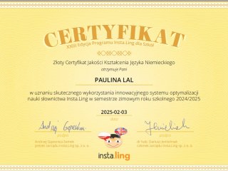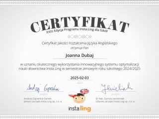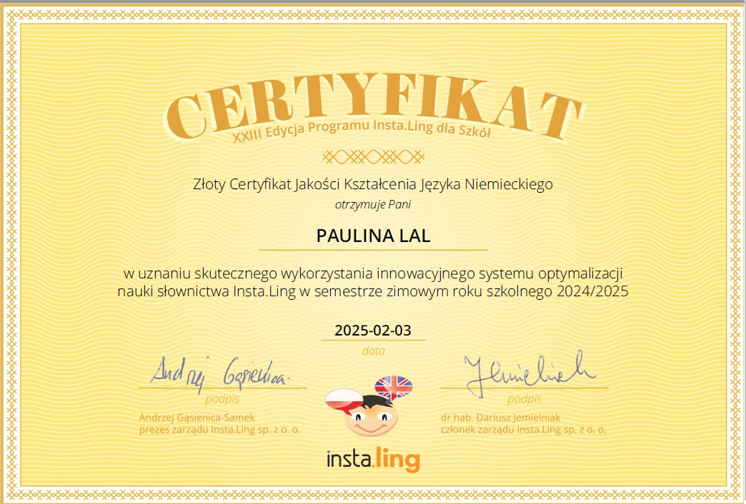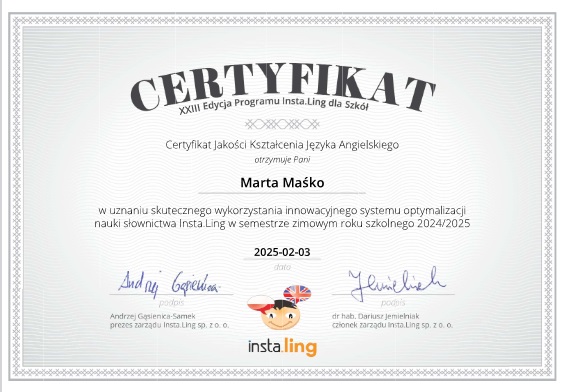 To już kolejny rok naszej współpracy i po raz kolejny uczniowie wraz ze swoimi nauczycielami języka angielskiego i niemieckiego otrzymali certyfikaty uczestnictwa, tym razem w XXIII edycji Programu Insta.Ling dla szkół pod patronatem Ministra Edukacji Narodowej.