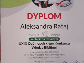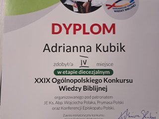 Nasze uczennica Aleksandra Rataj i Adrianna Kubik wzięły udział w 29. Ogólnopolskim Konkursie Wiedzy Biblijnej. Dziewczyny wykazały się bardzo szczegółową wiedzą i zajęły bardzo wysokie miejsca w etapie diecezjalnym. Serdecznie gratulujemy !!!