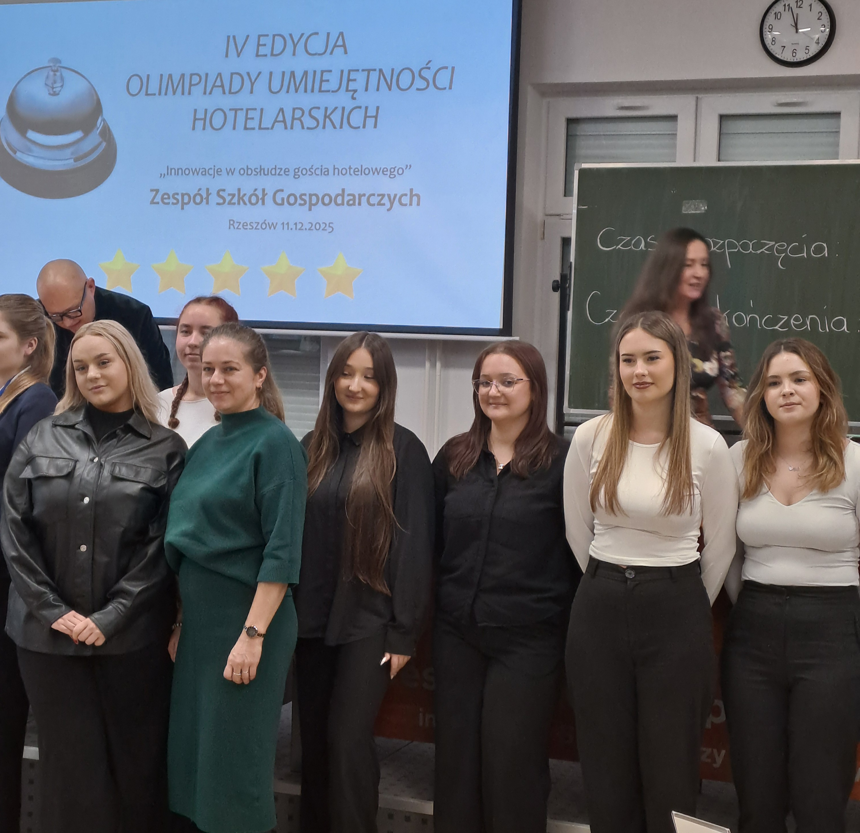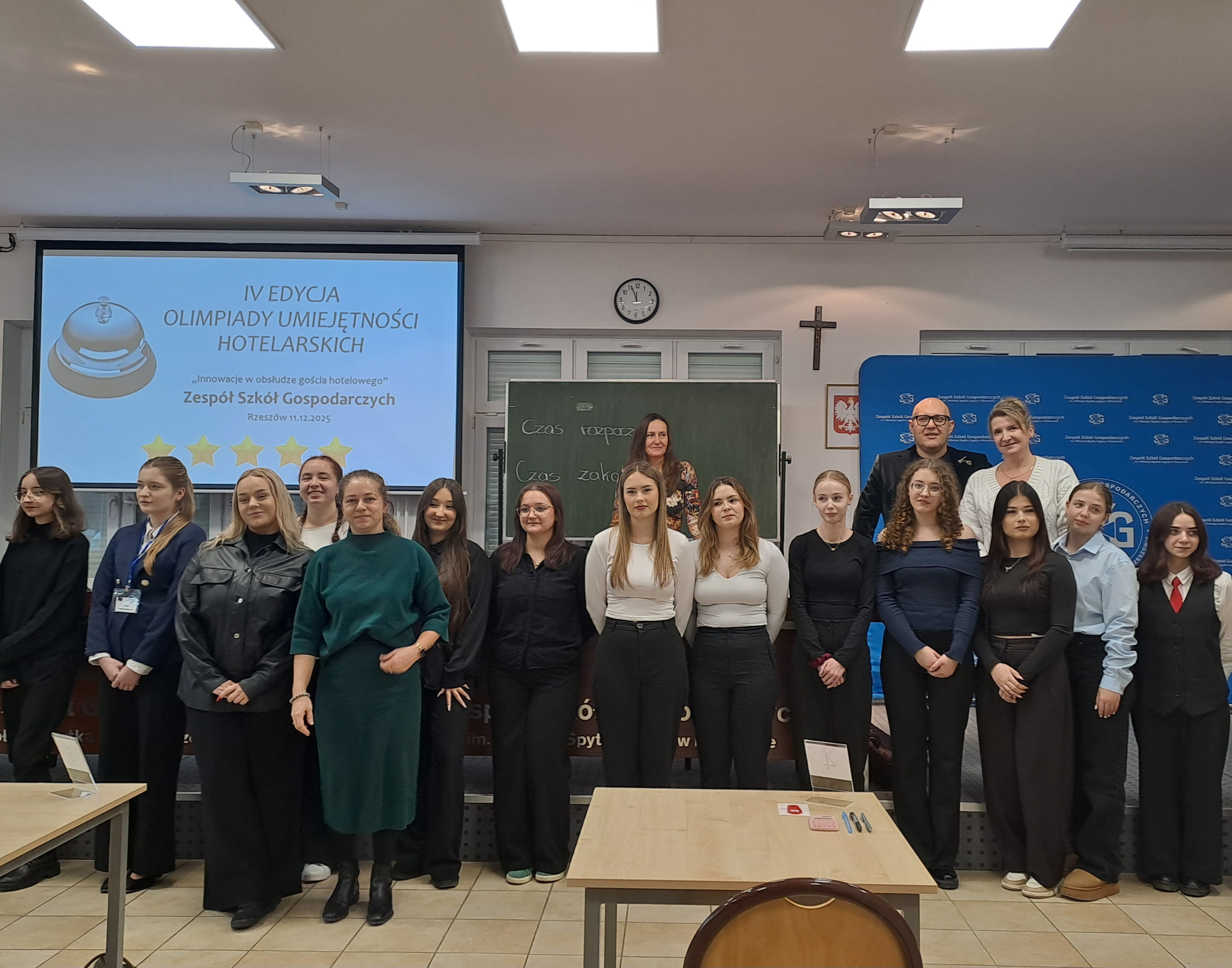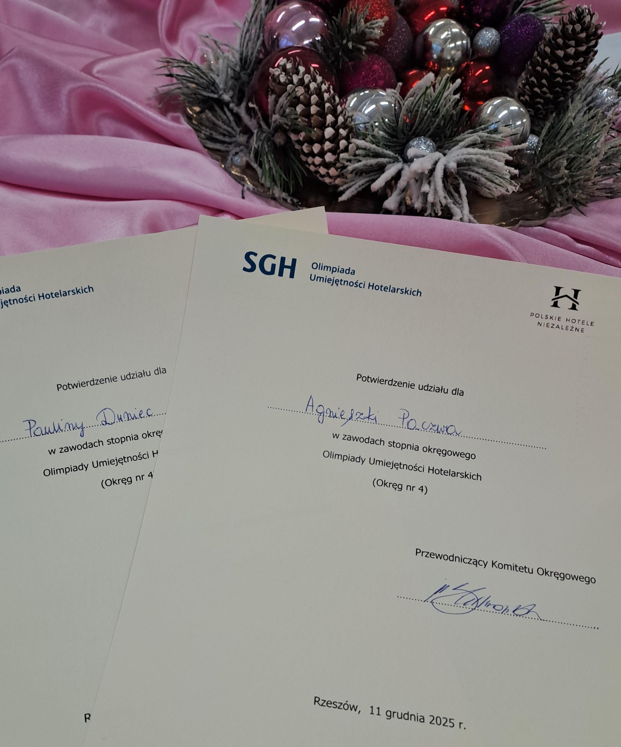 11 grudnia 2025r. w Zespole Szkół Gospodarczych w Rzeszowie odbył się etap okręgowy ogólnopolskiej „Olimpiady Umiejętności Hotelarskich”, do którego zakwalifikowały się dwie uczennice klasy V Technikum Hotelarskiego: Paulina Duniec oraz Agnieszka Paczwa. Uczennice rozwiązywały test składający się z 40 pytań oraz fragment zadania praktycznego, z którym poradziły sobie bardzo dobrze i uzyskały wysokie wyniki w etapie okręgowym. Organizatorem Olimpiady jest Szkoła Główna Handlowa w Warszawie, a współorganizatorem Fundacja Polskie Hotele Niezależne. Patronat honorowy sprawują: Izba Gospodarcza Hotelarstwa Polskiego, Ministerstwo Sportu i Turystyki oraz Polska Organizacja Turystyczna. Hasło IV edycji Olimpiady brzmi: „Innowacja w obsłudze gościa hotelowego”, a jej celem jest rozwijanie wiedzy
