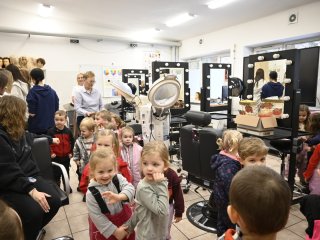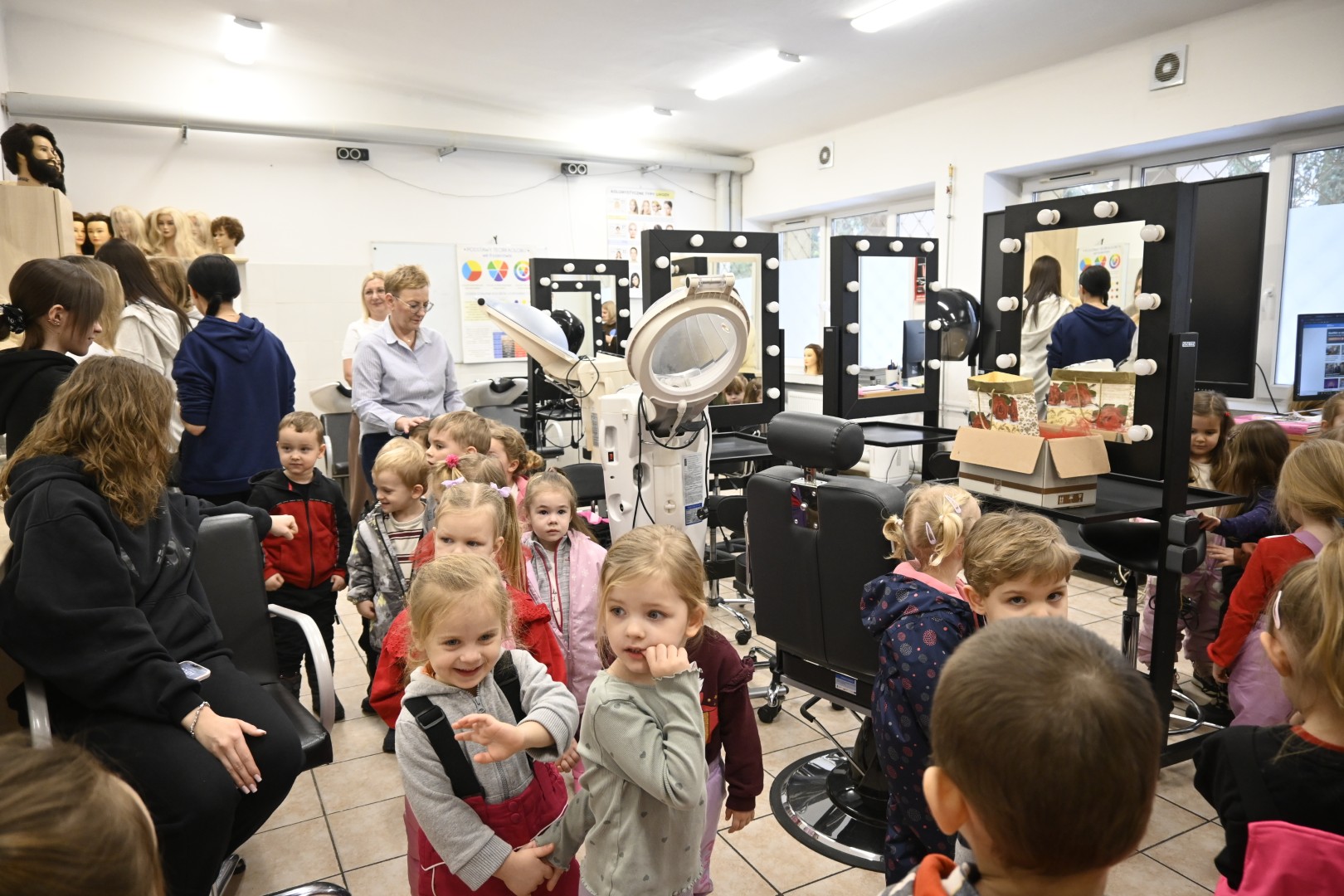 Podczas wizyty przedszkolaki odwiedziły również szkolne pracownie, m.in. mechaniczną, fryzjerską oraz odzieżową, a także miały okazję zobaczyć, jak uczy się tutejsza młodzież.