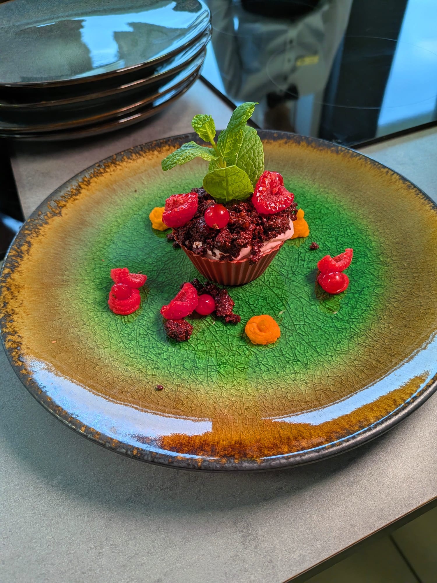 czekoladowy, biszkopt, kakaowa kruszonka „ziemia”, krem mascarpone i świeże