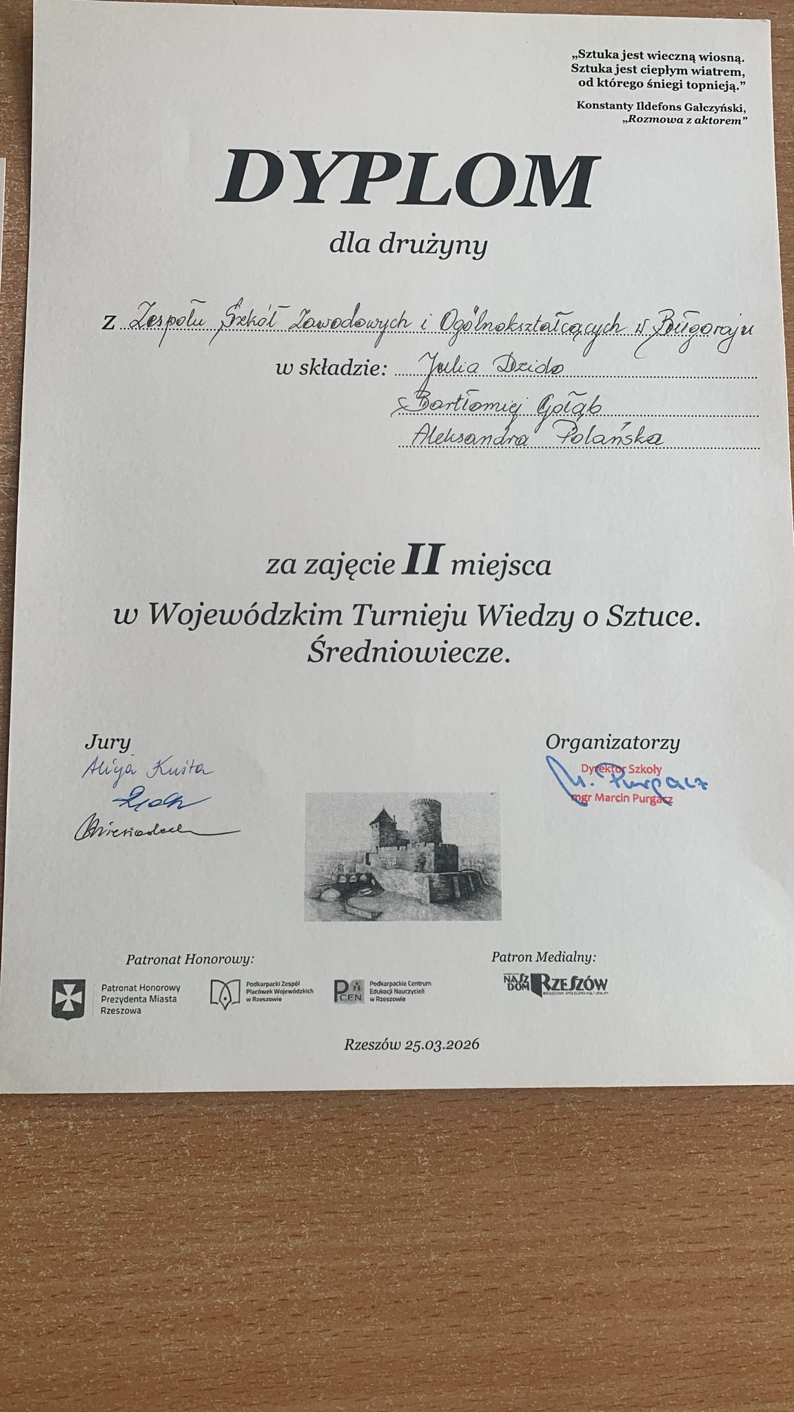 25 marca 2026 roku dwie drużyny z ZSZiO w Biłgoraju wzięły udział w VIII Wojewódzkim Turnieju Wiedzy o Sztuce Średniowiecza, który odbył się w Zespole Szkół Gospodarczych w Rzeszowie.