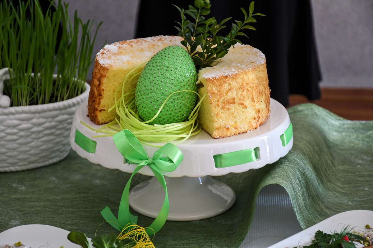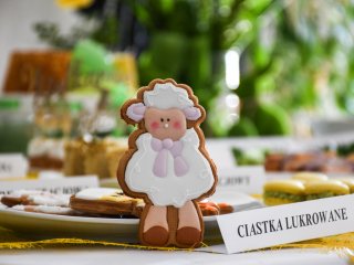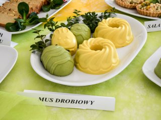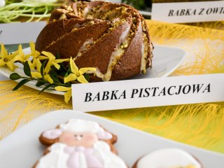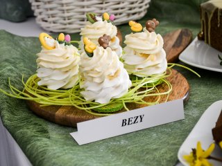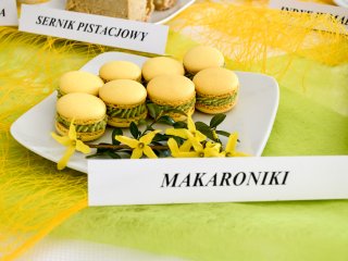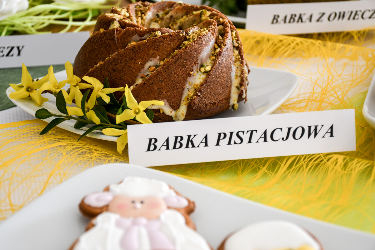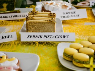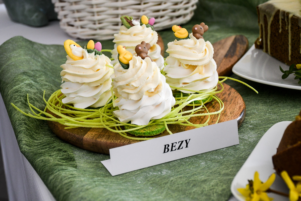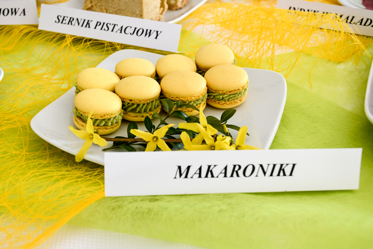 Słodkim uzupełnieniem stołu były bezy, babka pistacjowa, mazurek wielkanocny, monoporcje w zamszu, sernik pistacjowy, makaroniki i drobne ciasteczka .
