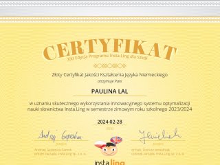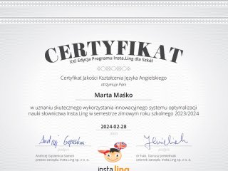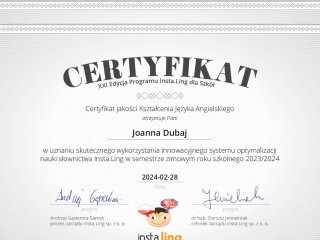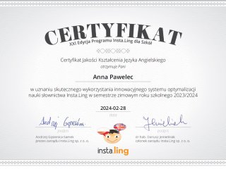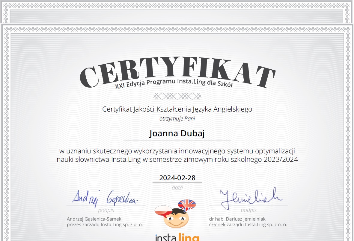 Miło nam poinformować, że po raz kolejny zdobyliśmy Certyfikat Jakości Kształcenia Języka Angielskiego oraz Języka Niemieckiego w uznaniu skutecznego wykorzystania innowacyjnego systemu optymalizacji nauki słownictwa Insta.Ling w semestrze zimowym roku szkolnego 2023/2024.