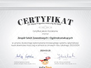Certyfikaty jakości kształcenia języków obcych Insta.Ling dla ZSZiO