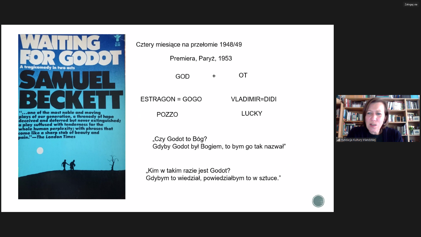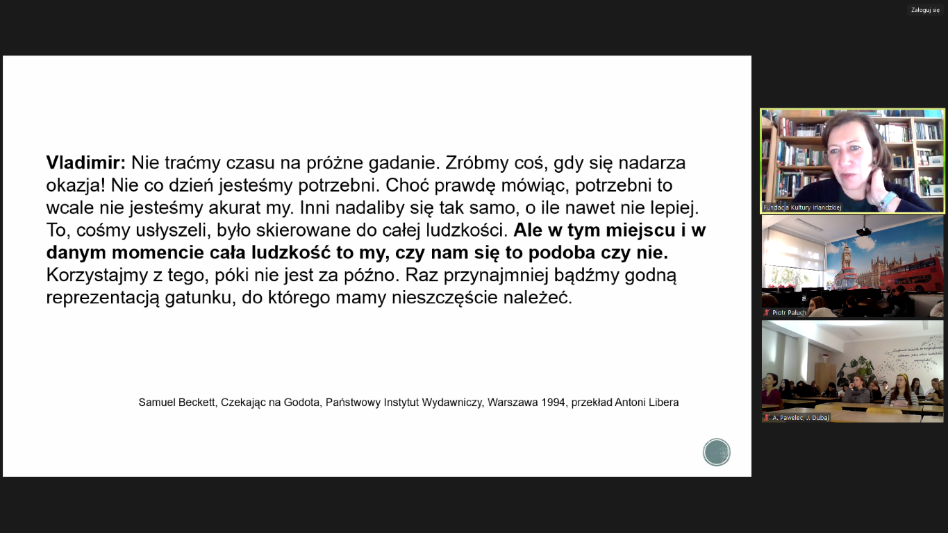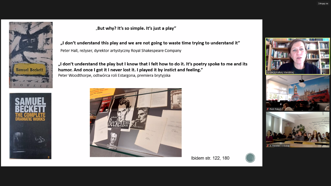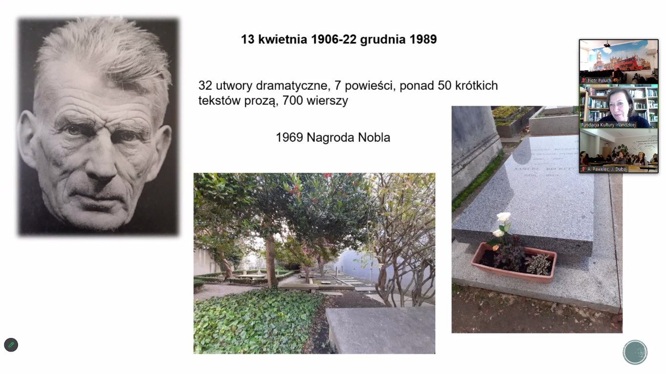 Temat spotkania to: „Ludzkość to my, czy nam się podoba czy nie” – w świecie twórczości Samuela Becketta, z okazji 55 rocznicy Literackiego Nobla dla wszechstronnego irlandzkiego twórcy między innymi teatru absurdu, znanego chyba najbardziej z dramatu „Czekając na Godota” z 1952 roku.