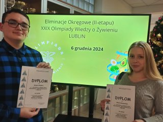 W dniach 6 i 9 grudnia 2024r. uczniowie naszej szkoły wzięli udział w eliminacjach okręgowych XXIX Olimpiady Wiedzy o Żywieniu. Tematyką wiodącą tegorocznej olimpiady jest: "Żywność wspierająca odporność."