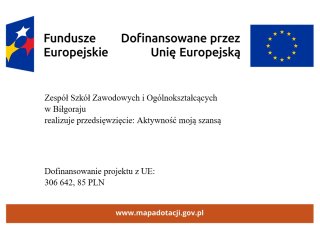 Zespół Szkół Zawodowych i Ogólnokształcących w Biłgoraju realizuje przedsięwzięcie „Aktywność moją szansą” w ramach projektu „Zagraniczna mobilność edukacyjna uczniów i absolwentów oraz kadry kształcenia zawodowego" w ramach programu Fundusze Europejskie dla Rozwoju Społecznego 2021-2027 (FERS) współfinansowanego ze środków Europejskiego Funduszu Społecznego Plus.