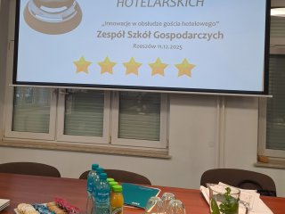 11 grudnia 2025r. w Zespole Szkół Gospodarczych w Rzeszowie odbył się etap okręgowy ogólnopolskiej „Olimpiady Umiejętności Hotelarskich”, do którego zakwalifikowały się dwie uczennice klasy V Technikum Hotelarskiego: Paulina Duniec oraz Agnieszka Paczwa. Uczennice rozwiązywały test składający się z 40 pytań oraz fragment zadania praktycznego, z którym poradziły sobie bardzo dobrze i uzyskały wysokie wyniki w etapie okręgowym. Organizatorem Olimpiady jest Szkoła Główna Handlowa w Warszawie, a współorganizatorem Fundacja Polskie Hotele Niezależne. Patronat honorowy sprawują: Izba Gospodarcza Hotelarstwa Polskiego, Ministerstwo Sportu i Turystyki oraz Polska Organizacja Turystyczna. Hasło IV edycji Olimpiady brzmi: „Innowacja w obsłudze gościa hotelowego”, a jej celem jest rozwijanie wiedzy