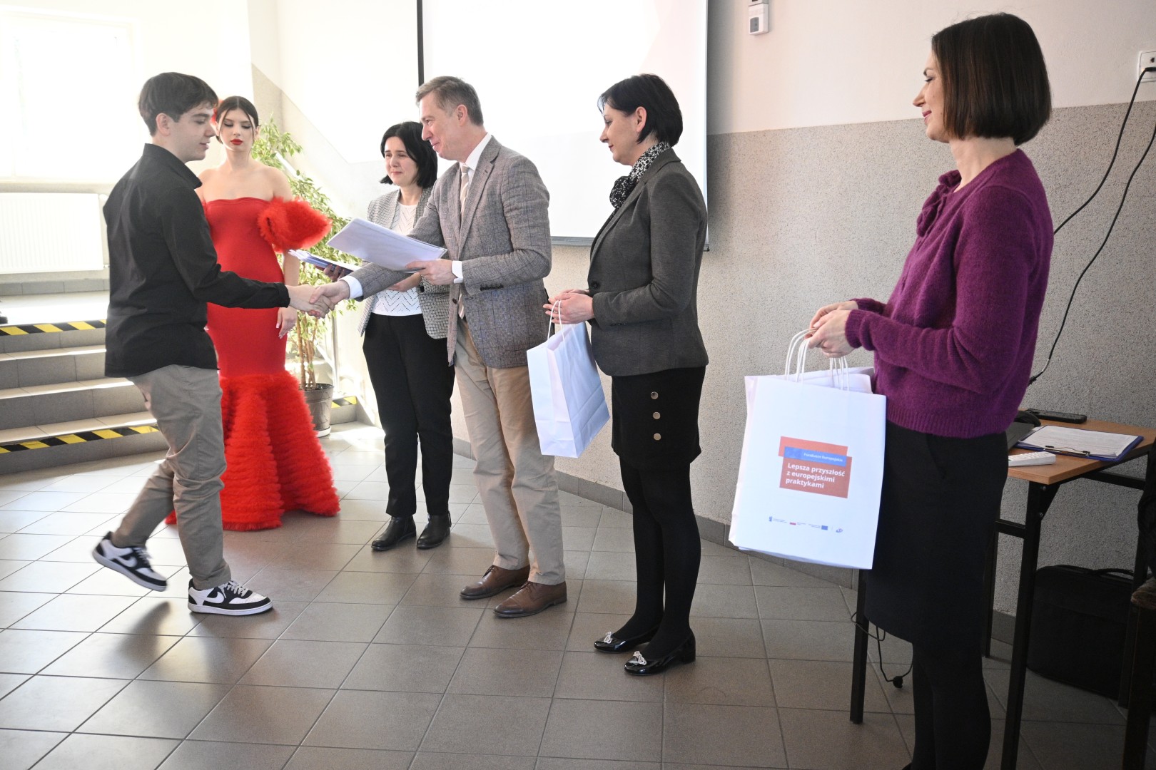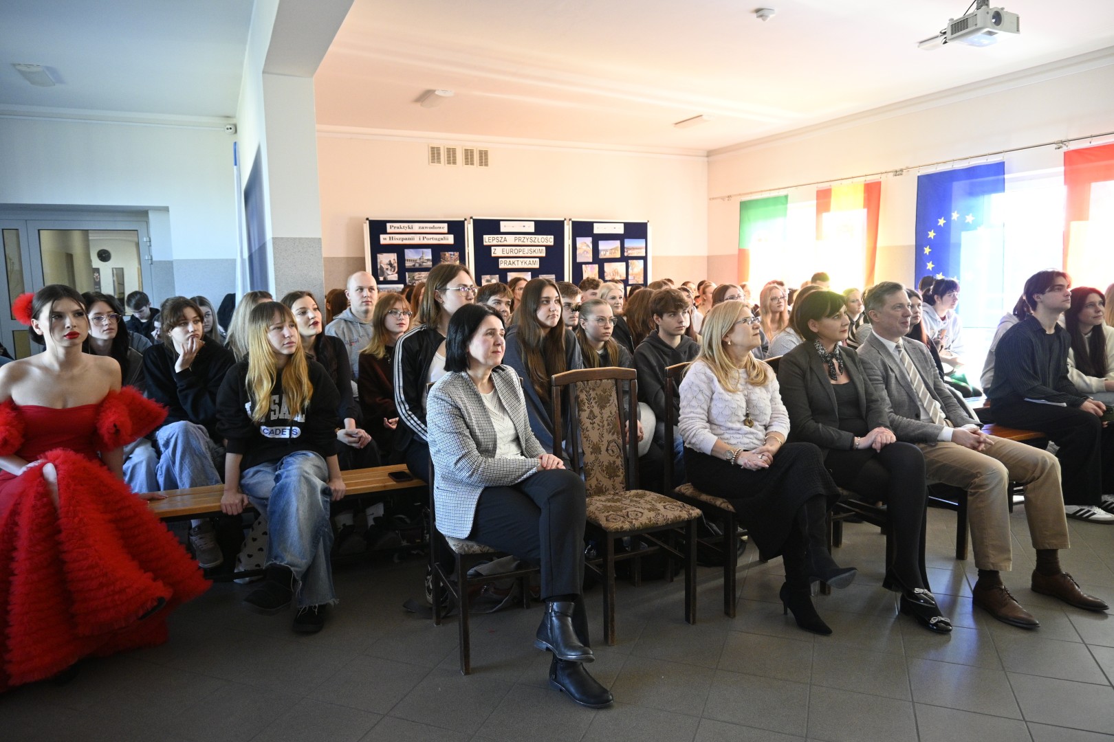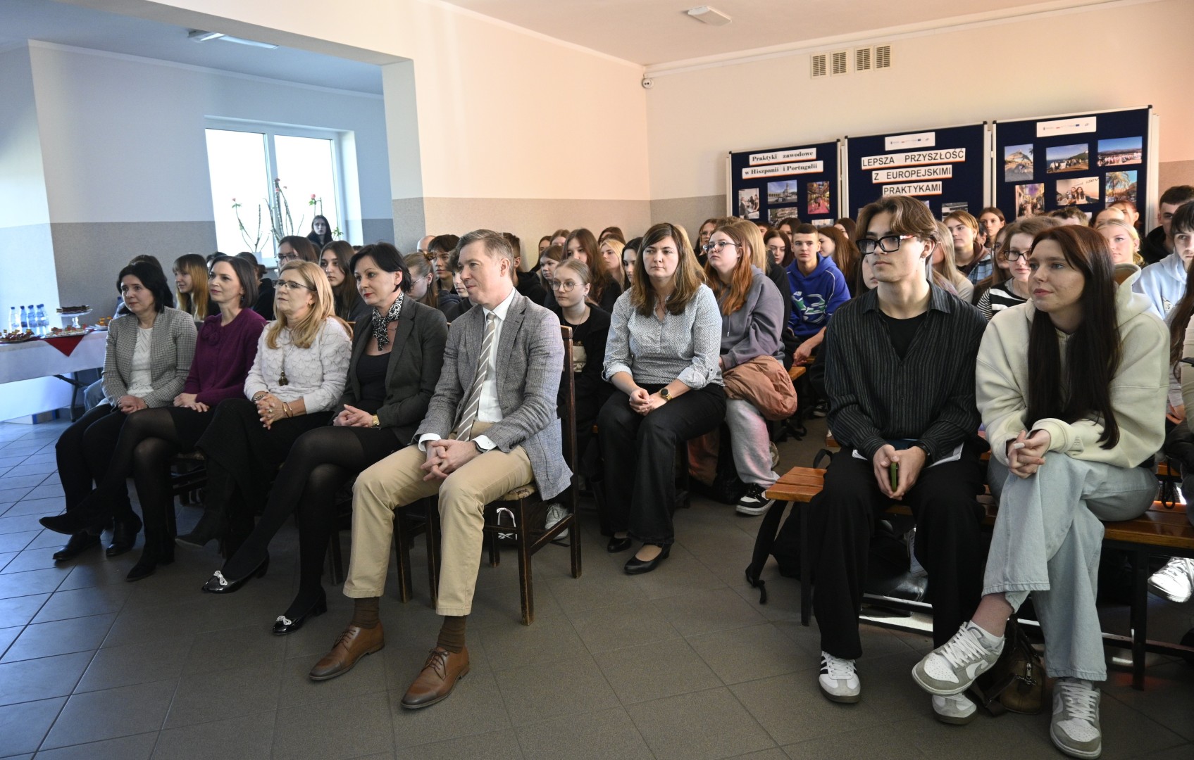 W dniu 6 marca 2025 r. odbyło się spotkanie upowszechniające zrealizowany projekt „Lepsza przyszłość z europejskimi praktykami”. W wydarzeniu uczestniczył Pan Dyrektor Adam Balicki, Pani Wicedyrektor Dorota Wszolak, Pani Katarzyna Bełżek reprezentująca organ prowadzący, a także uczestnicy I i II mobilności, opiekunowie, nauczyciele oraz społeczność szkolna i lokalne media. W trakcie spotkania mieliśmy okazję wysłuchać relacji uczniów, którzy dzielili się swoimi doświadczeniami z praktyk zawodowych w Hiszpanii i Portugalii. Mogliśmy podziwiać suknię flamenco uszytą przez uczennice Technikum przemysłu mody oraz zasmakować dań kuchni hiszpańskiej i portugalskiej przygotowanych przez uczniów Szkoły Branżowej I Stopnia oraz Technikum żywienia i usług gastronomicznych. Podczas wydarzenia Pan Dyrektor wręczył uczestnikom I i II mobilności dokumenty Europass Mobilność.