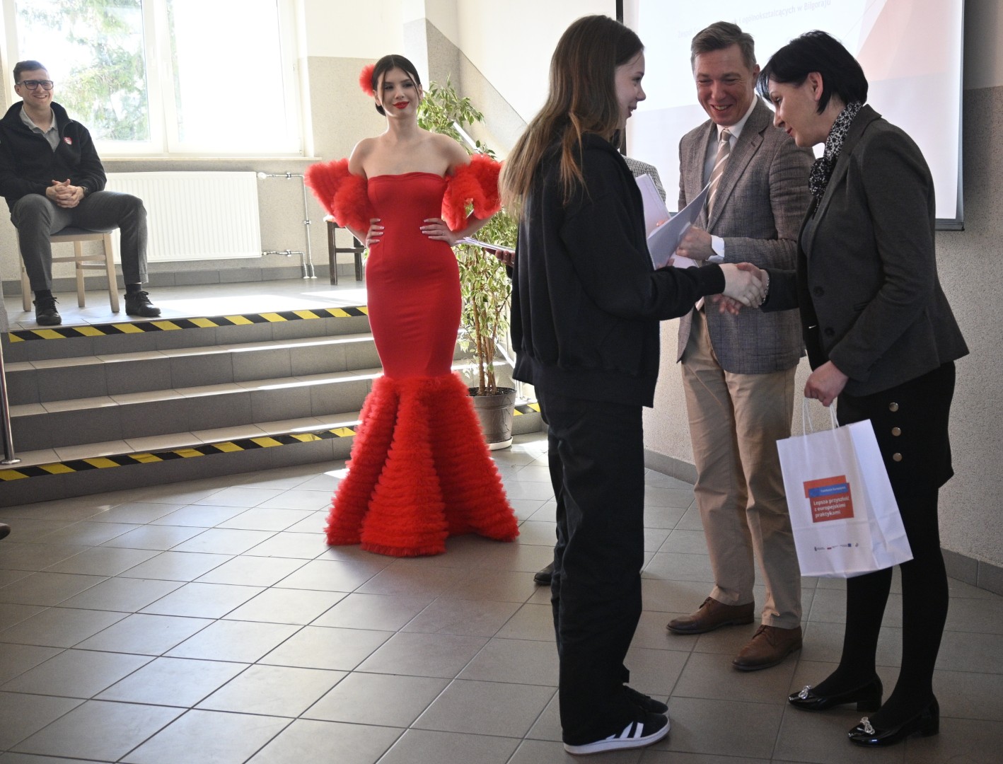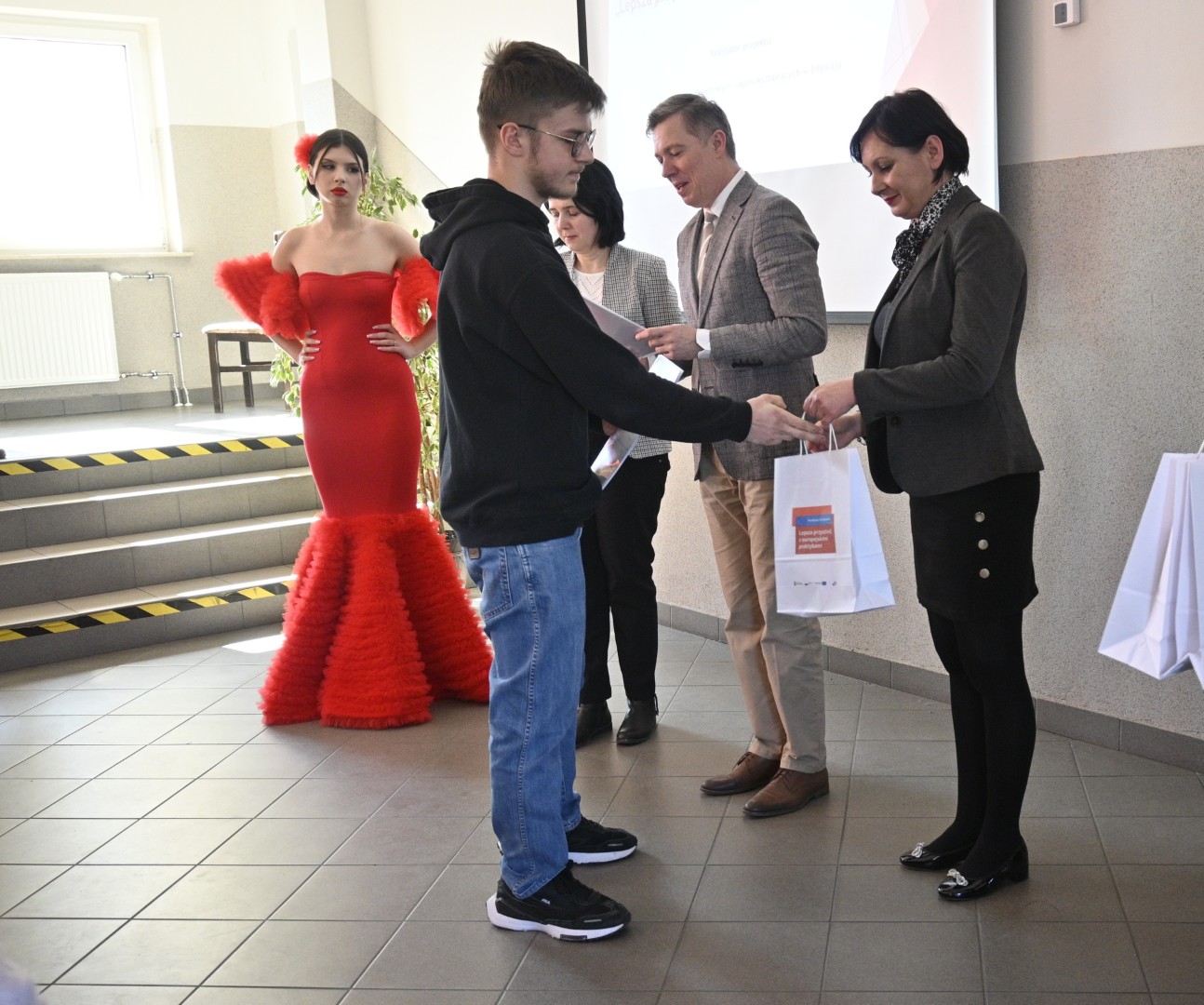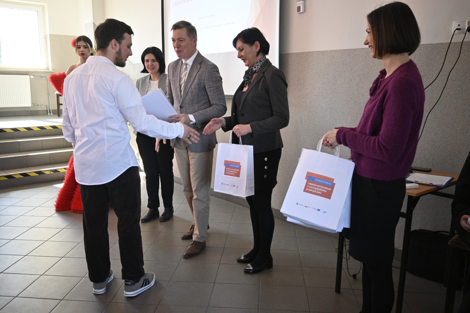 W dniu 6 marca 2025 r. odbyło się spotkanie upowszechniające zrealizowany projekt „Lepsza przyszłość z europejskimi praktykami”. W wydarzeniu uczestniczył Pan Dyrektor Adam Balicki, Pani Wicedyrektor Dorota Wszolak, Pani Katarzyna Bełżek reprezentująca organ prowadzący, a także uczestnicy I i II mobilności, opiekunowie, nauczyciele oraz społeczność szkolna i lokalne media. W trakcie spotkania mieliśmy okazję wysłuchać relacji uczniów, którzy dzielili się swoimi doświadczeniami z praktyk zawodowych w Hiszpanii i Portugalii. Mogliśmy podziwiać suknię flamenco uszytą przez uczennice Technikum przemysłu mody oraz zasmakować dań kuchni hiszpańskiej i portugalskiej przygotowanych przez uczniów Szkoły Branżowej I Stopnia oraz Technikum żywienia i usług gastronomicznych. Podczas wydarzenia Pan Dyrektor wręczył uczestnikom I i II mobilności dokumenty Europass Mobilność.