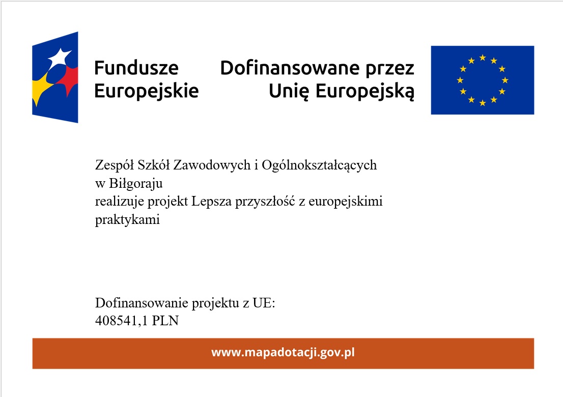 Informujemy, że rozpoczynamy rekrutację do kolejnego projektu realizowanego w naszej szkole. Projekt „Lepsza przyszłość z europejskimi praktykami” nr 2023-1-PL01-KA122-VET-000139243 realizowany jest ze środków Europejskiego Funduszu Społecznego Plus w ramach Programu Fundusze Społeczne dla Rozwoju Społecznego (FERS) 2021-2027, projektu „Zagraniczna mobilność edukacyjna uczniów i absolwentów oraz kadry kształcenia zawodowego” na zasadach Programu Erasmus+.
